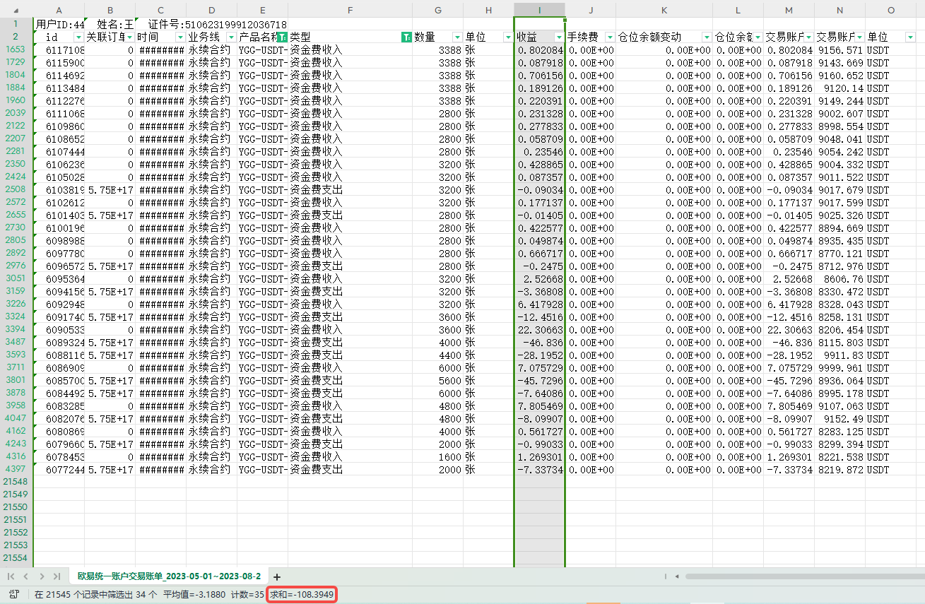 7、筛选,类型:资金费收入、资金费支出,点击 收益 列,求和:-108.3849。由此可见,OKX 的资金费用真心高企了。平仓的收益,有 108.3849/529.7068 = 0.20,大约 20% 的平空收益都被用于资金费的支出。如图6