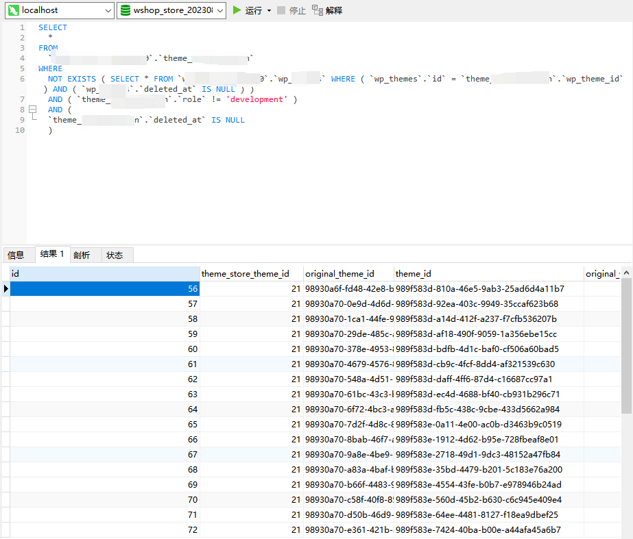 SELECT * FROM `db1_20230810`.`table1` WHERE NOT EXISTS ( SELECT * FROM `db2_20230810`.`table2` WHERE ( `table2`.`id` = `table1`.`table2_id` ) AND ( `table2`.`deleted_at` IS NULL ) ) AND ( `table1`.`role` != 'development' ) AND ( `table1`.`deleted_at` IS NULL )