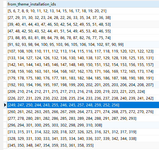 1、json 字段中存储的是数组格式,值示例:[249, 247, 250, 244, 243, 255, 246, 245, 257, 248, 259, 252, 256]。如图1