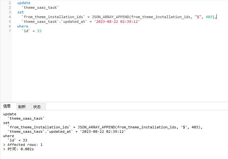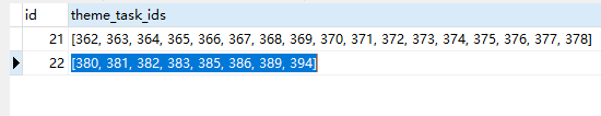 6、当在队列中并发运行时,字段 theme_task_ids 中总计有 17 个值,理论上来说,执行了 17 次以后,`id` = 22 应该会被删除掉。但是,实际上,字段 theme_task_ids 中还剩下 [380, 381, 382, 383, 385, 386, 389, 394]。执行的 SQL 如下: 如图4