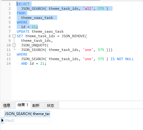 SELECT JSON_SEARCH( theme_task_ids, 'all', '375' ) FROM theme_saas_task WHERE id = 21;