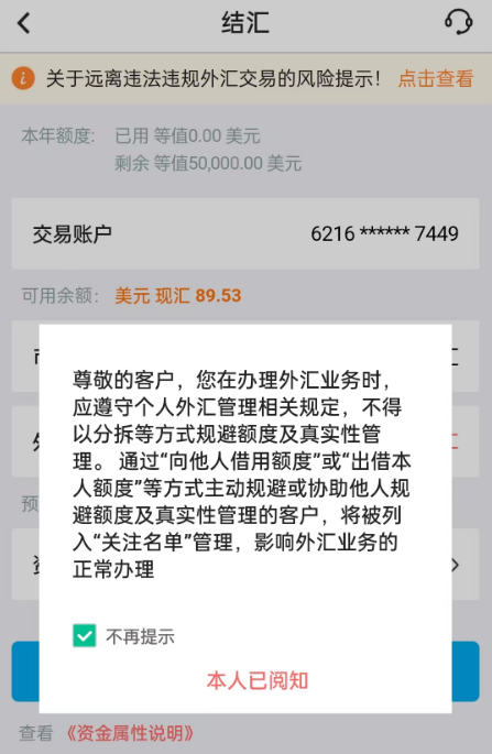 4、提示:尊敬的客户,您在办理外汇业务时应遵守个人外汇管理相关规定,不得以分拆等方式规避额度及真实性管理。通过“向他人借用额度”或“出借本人额度”等方式主动规避或协助他人规避额度及真实性管理的客户,将被列入“关注名单”管理,影响外汇业务的正常办理。如图3