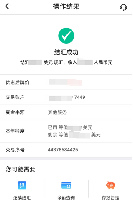 6、操作结果,结汇成功,结汇 * 美元现汇,收入 * 人民币元。如图5
