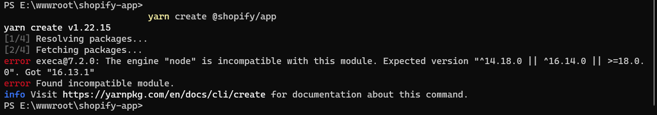 PS E:\wwwroot\shopify-app>yarn create @shopify/app yarn create v1.22.15 [1/4] Resolving packages... [2/4] Fetching packages... error execa@7.2.0: The engine "node" is incompatible with this module. Expected version "^14.18.0 || ^16.14.0 || >=18.0.0". Got "16.13.1" error Found incompatible module. info Visit https://yarnpkg.com/en/docs/cli/create for documentation about this command.