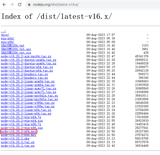 2、^16.14.0相当于>=16.14.0,<16.15,决定重新安装 Node.js 的 16 的最新版本。打开网址:https://nodejs.org/dist/latest-v16.x/ 计划下载 node-v16.20.2-x64.msi 。但是,发现其不符合版本依赖的要求。如图2