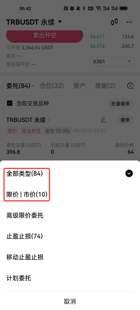 1、在 欧易 APP 中:发现限价委托突然消失。全部类型(84) 限价|市价(10) 。全部类型与限价|市价的数量皆大幅减少。如图1