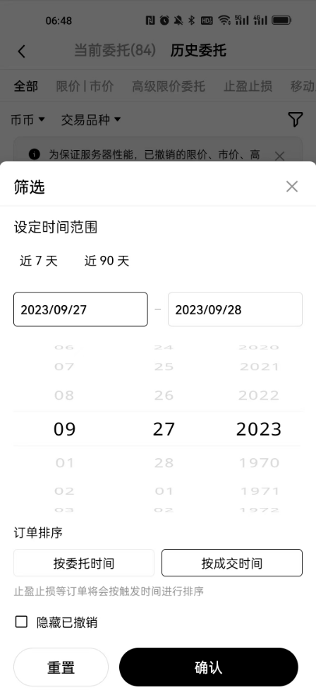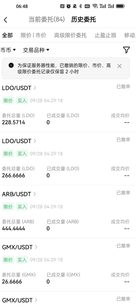 4、为保证服务器性能,已撤销的限价、市价、高X级限价委托记录仅保留2小时。大量的委托皆是在 09/28 04:29:18 被撤销。如图4