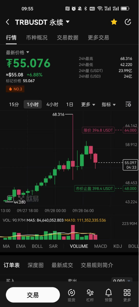5、初步分析得出结论,原因应该在于 TRBUSDT永续 在 09/28 04:30 左右突然插针,导致大量亏损,可用保证金已经是负数。所以大量的委托被撤销,以追加保证金。如图5
