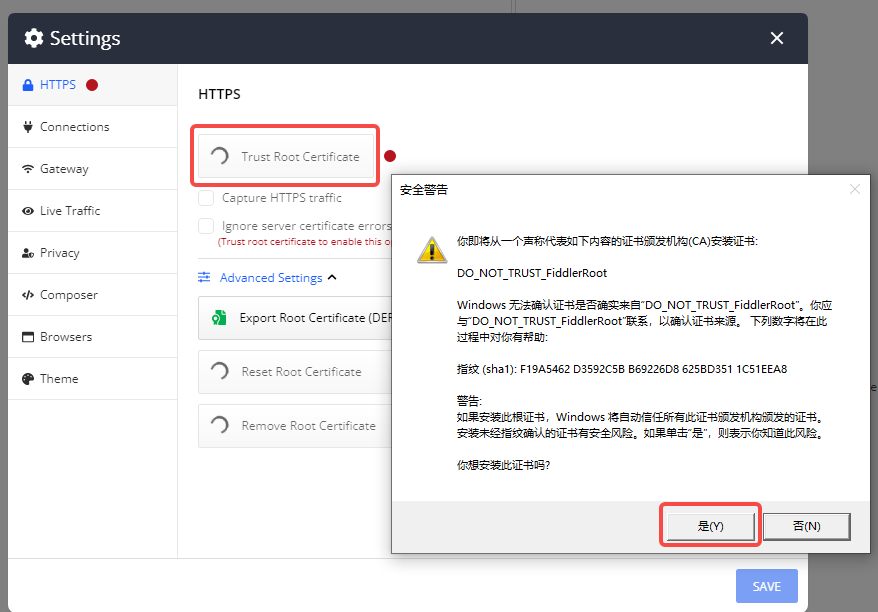 3、默认情况下,您只能使用 Fiddler Everywhere 跟踪非安全 HTTP 系统流量。 因此,要启用 HTTPS 系统流量的捕获,您必须安装并信任 Fiddler 根证书。设置 – HTTPS – Trust Root Certificate。防止 Fiddler Classic 证书的影响。如图2