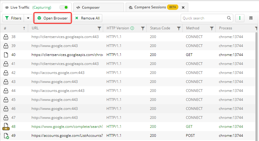 6、点击 Open Browser ,打开默认的 Google Chrome 浏览器,流量可以自动捕获。如图5
