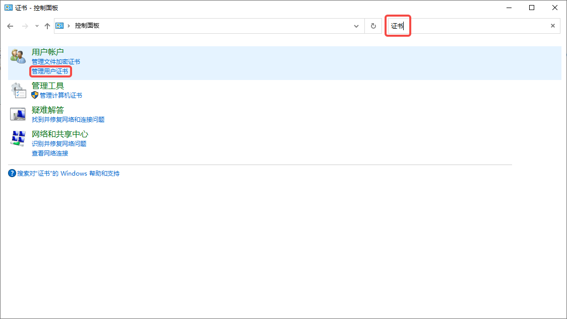 11、卸载 Fiddler Everywhere 后,打开控制面板,搜索证书。如图7