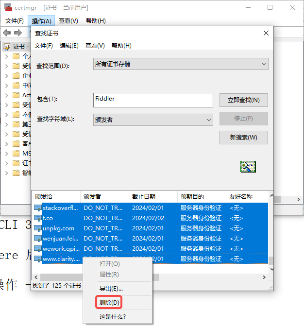 12、点击 管理用户证书,操作 – 查找证书,搜索:Fiddler,全部选择,然后删除。如图8