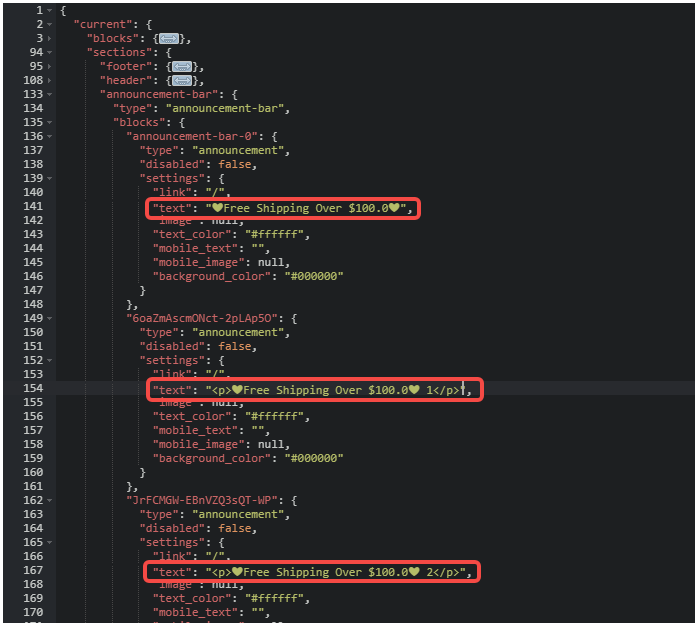 3、announcement-bar 需要加上双引号,否则会报错:Invalid JSON path expression. The error is around character position 35.。如图3