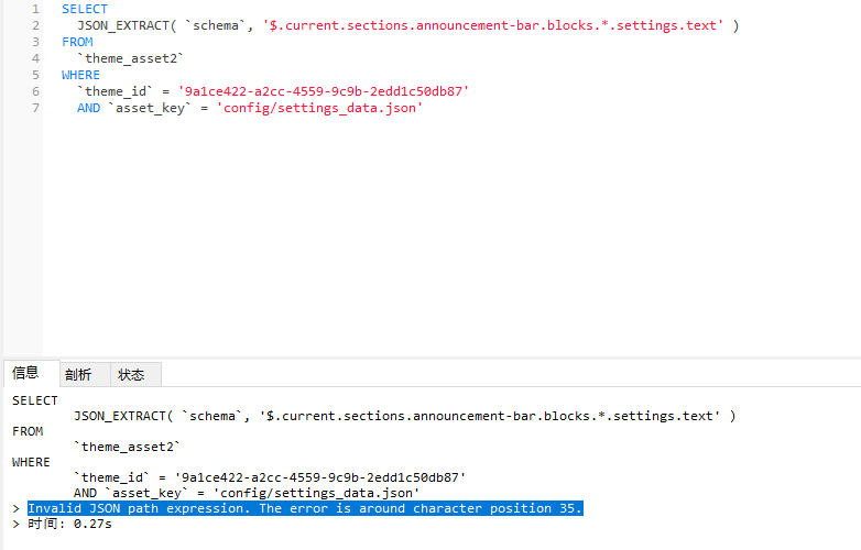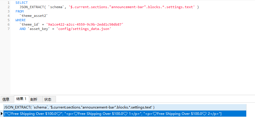 1、在 json 字段中的值如下所示。需要查询的字段:$.current.sections.announcement-bar.blocks.*.settings.text。其中 * 所对应的字段 key 是未知的。如图1