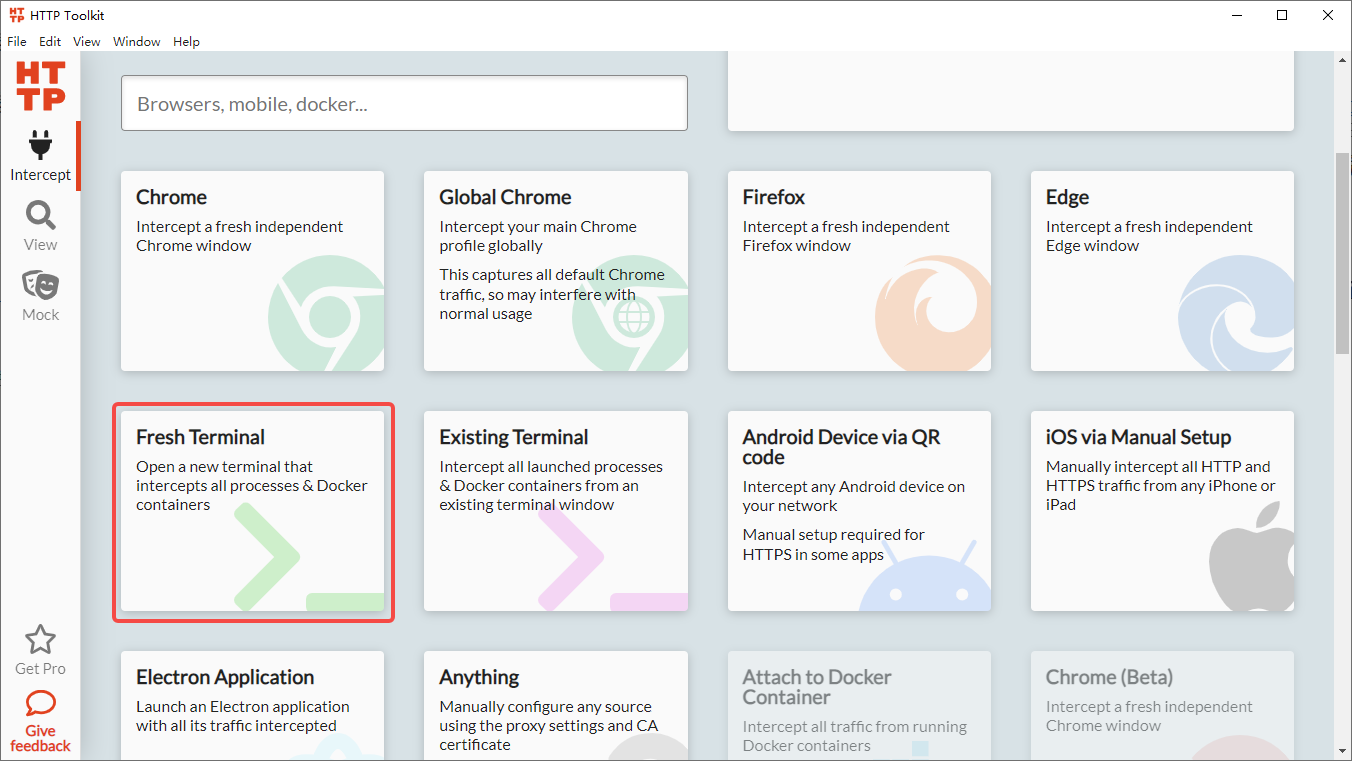 2、参考:如果您只是为 Node.js 寻找一个类似 fiddler 的 HTTP 调试工具,一个名为 HTTP Toolkit 的开源项目,一键从应用程序打开终端。从该终端启动任何节点 CLI/服务器/脚本。它发送的所有 HTTP 或 HTTPS 请求都会自动代理,因此您可以查看和重写所有内容。无需更改代码或 npm 包。在内部,它的工作方式是将额外的 JS 脚本注入到启动的 Node 进程中,该脚本挂钩 require() 来自动为您重新配置代理设置,对于每个不使用全局设置的模块。