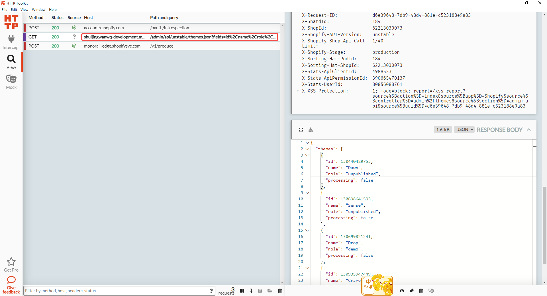 6、在 HTTP Toolkit 中查看已经被捕获的流量,符合期望。已经存在对应的请求:https://shuijingwanwq-development.myshopify.com/admin/api/unstable/themes.json?fields=id%2Cname%2Crole%2Cprocessing ,且响应为明文。如图3