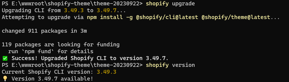 PS E:\wwwroot\shopify-theme\theme-20230922> shopify upgrade Upgrading CLI from 3.49.3 to 3.49.7... Attempting to upgrade via npm install -g @shopify/cli@latest @shopify/theme@latest... changed 911 packages in 3m 119 packages are looking for funding run `npm fund` for details ✅ Success! Upgraded Shopify CLI to version 3.49.7. PS E:\wwwroot\shopify-theme\theme-20230922> shopify version Current Shopify CLI version: 3.49.3 💡 Version 3.49.7 available! PS E:\wwwroot\shopify-theme\theme-20230922>