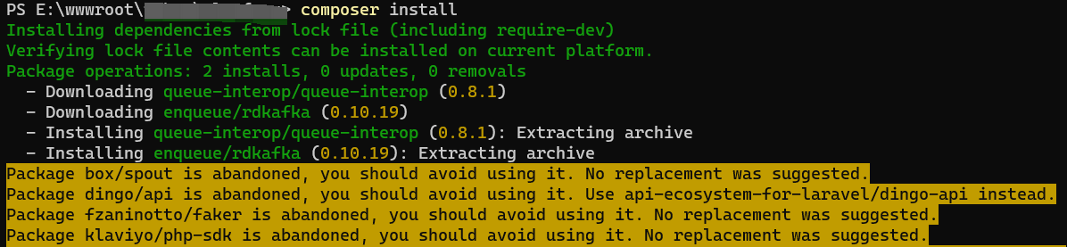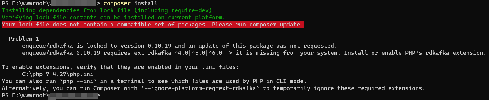 1、执行:composer install 时,提示:enqueue/rdkafka 0.10.19 requires ext-rdkafka -> it is missing from your system. Install or enable PHP’s rdkafka extension.。如图1