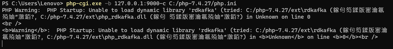 PS C:\Users\Lenovo> php-cgi.exe -b 127.0.0.1:9000-c C:/php-7.4.27/php.ini PHP Warning: PHP Startup: Unable to load dynamic library 'rdkafka' (tried: C:/php-7.4.27/ext\rdkafka (鎵句笉鍒版寚瀹氱殑妯″潡銆?, C:/php-7.4.27/ext\php_rdkafka.dll (鎵句 笉鍒版寚瀹氱殑妯″潡銆?) in Unknown on line 0 <br /> <b>Warning</b>: PHP Startup: Unable to load dynamic library 'rdkafka' (tried: C:/php-7.4.27/ext\rdkafka (鎵句笉鍒版寚瀹氱殑妯″潡銆?, C:/php-7.4.27/ext\php_rdkafka.dll (鎵句笉鍒版寚瀹氱殑妯″潡銆?) in <b>Unknown</b> on line <b>0</b><br />