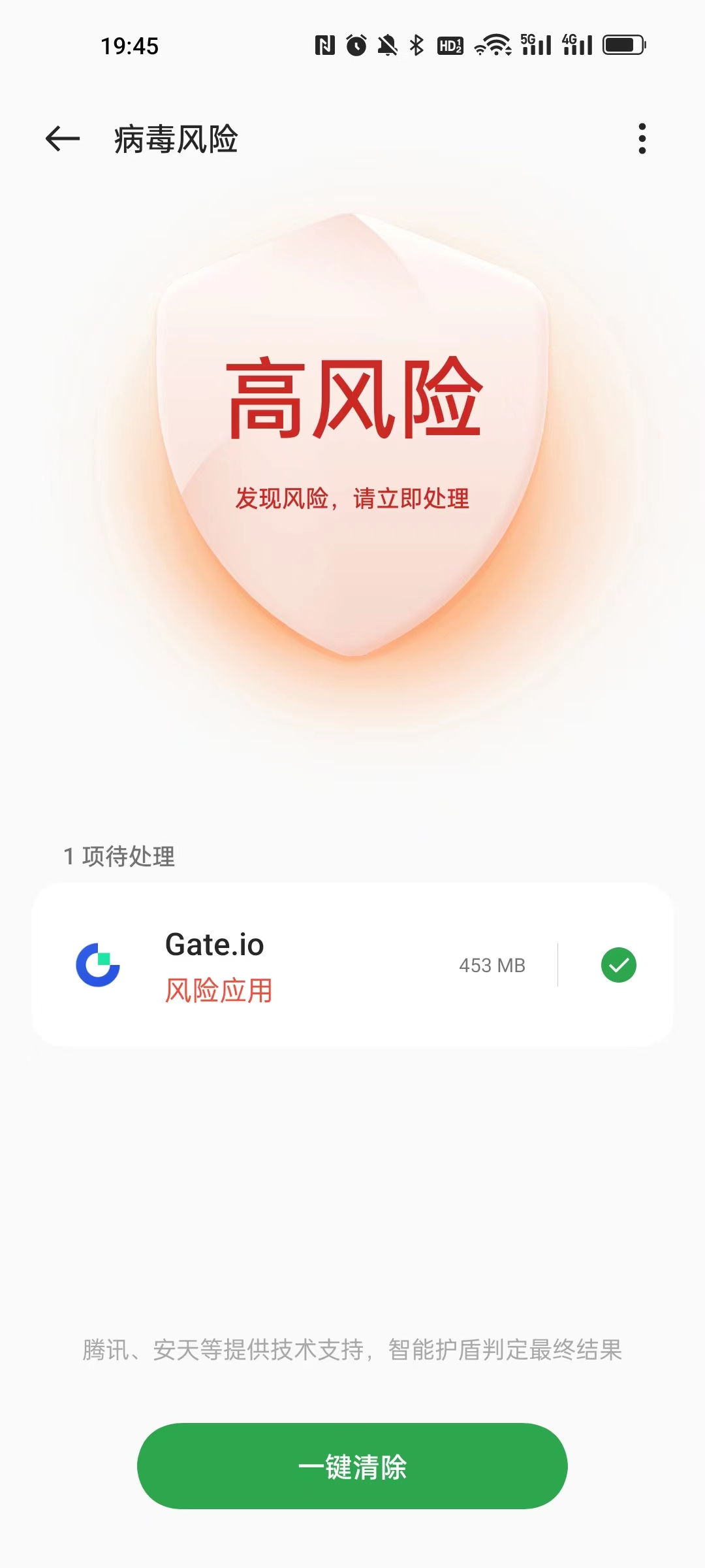 1、在一加手机中,打开支付宝时,弹出提示:发现1个病毒危险,请立即处理。 Gate.io 。如图1
