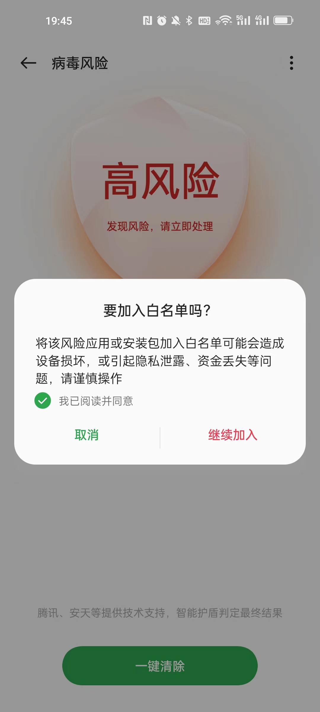 4、点击 加入白名单 ,要加入白名单吗?将该风险应用或安装包加入白名单可能会造成设备损坏,或引起隐私泄露、资金丢失等问题,请谨慎操作。点击 继续加入。如图4