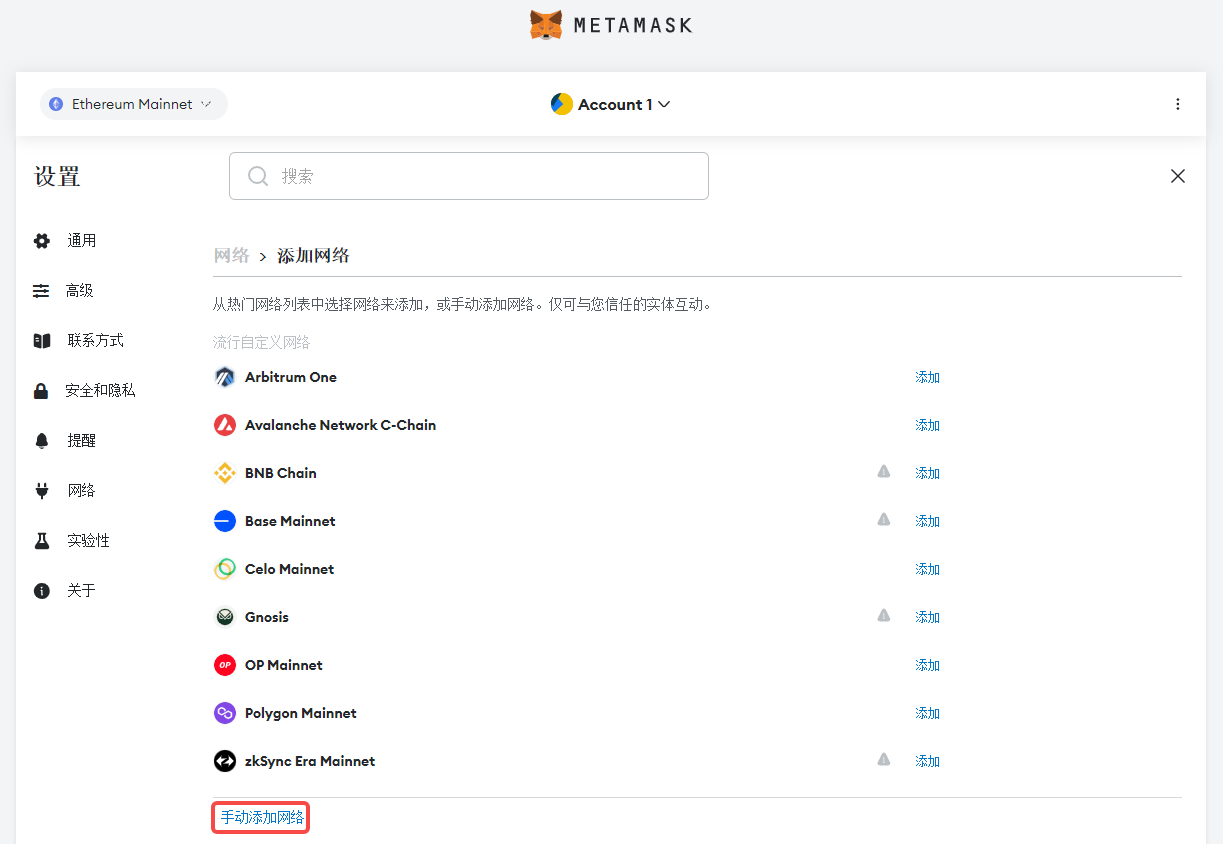 2、网络 > 添加网络,点击 手动添加网络。如图1
