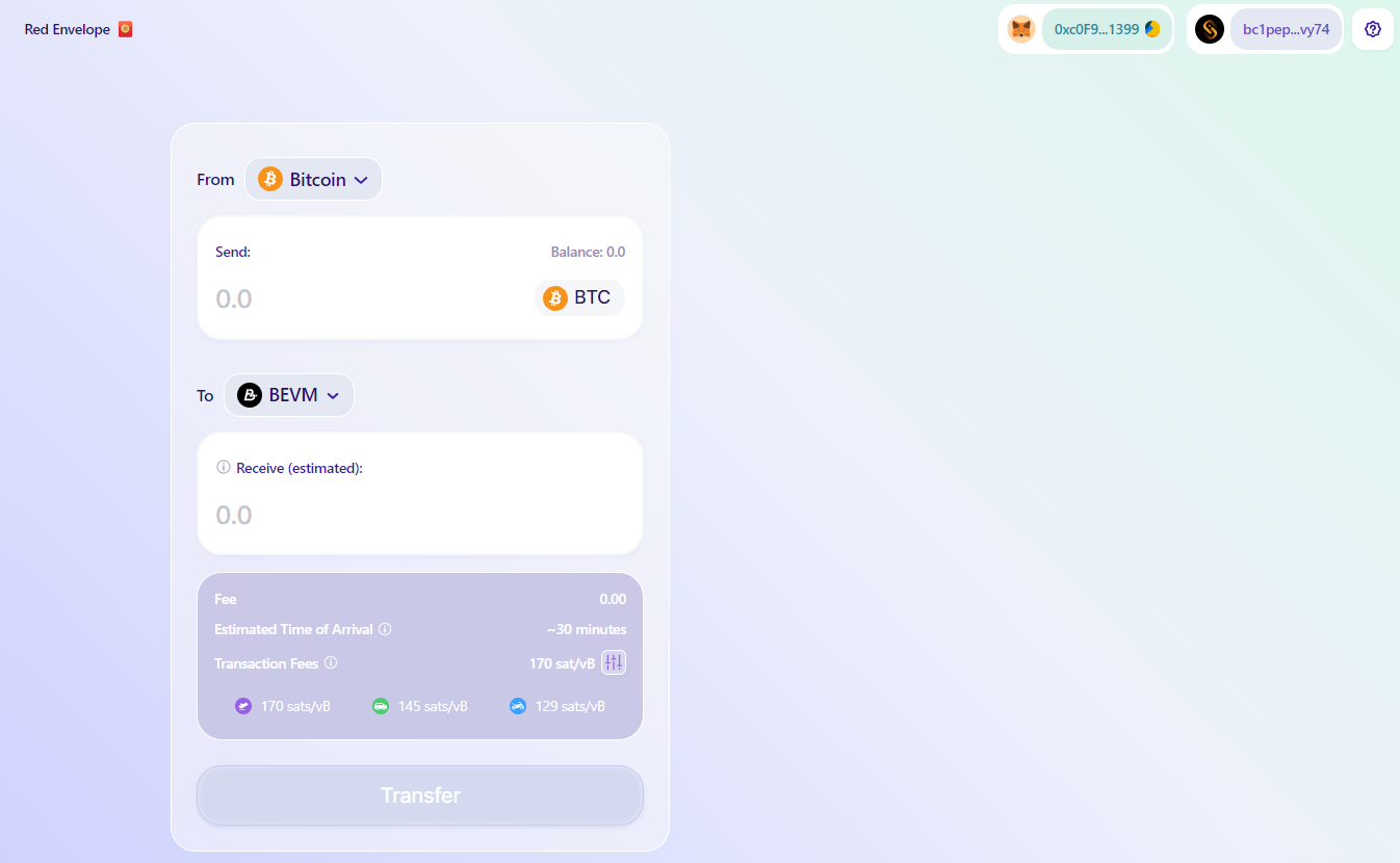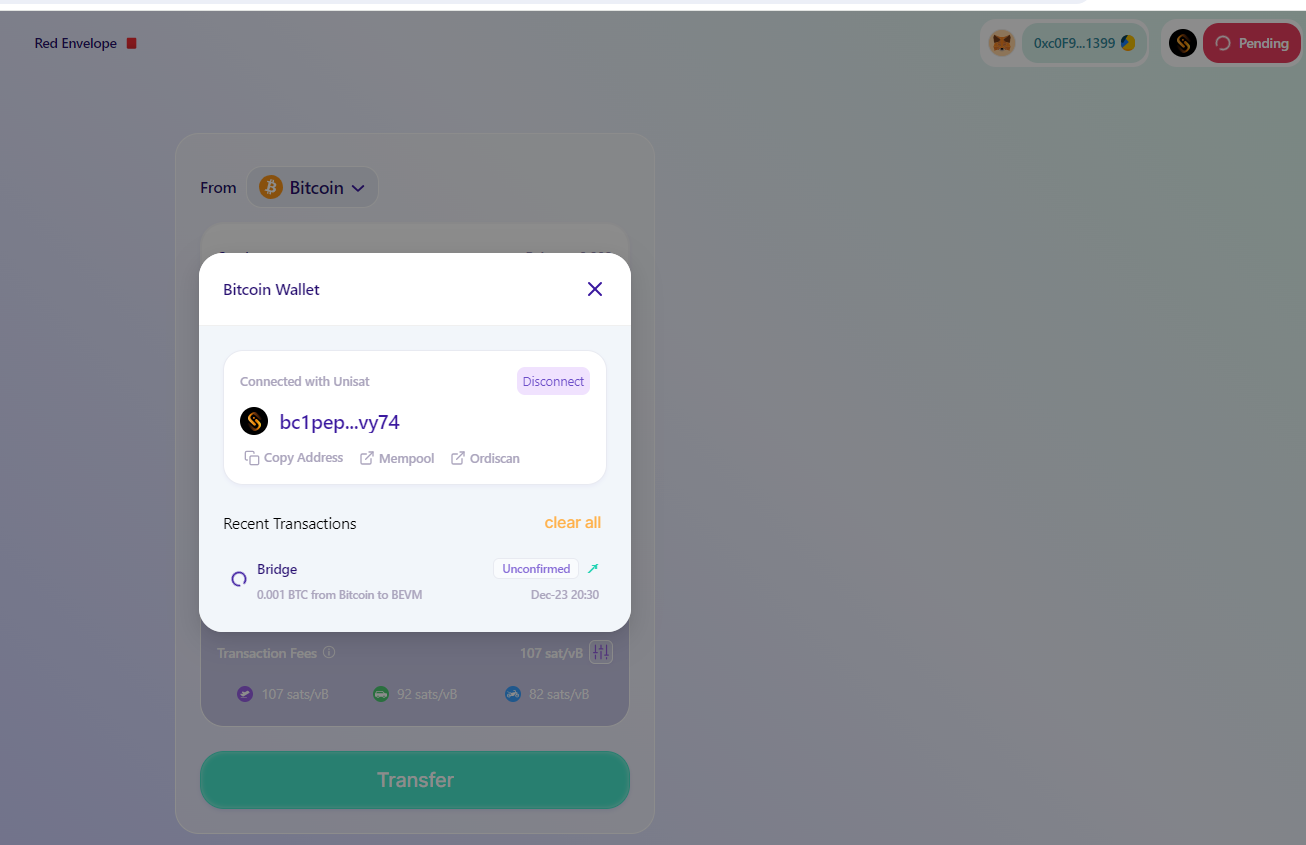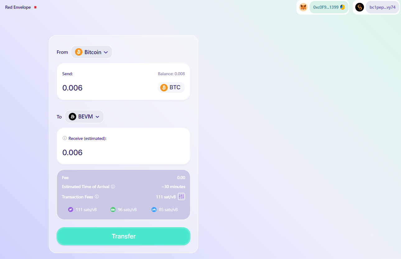 12、选择 BTC 并输入您想要桥接的金额。手动选择交易费用水平。注:目前BEVM提供了手动设置Gas费标准的功能。 确认费用水平后,点击转账即可发起转账。 为了保证用户资产的安全,划转至BEVM的资产需要经过比特币主网的3次确认(至少30分钟)。如图11