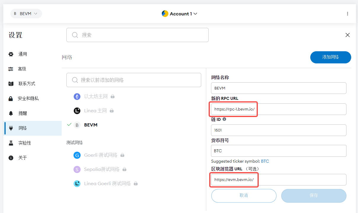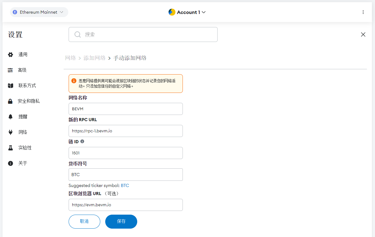 1、在小狐狸钱包中添加自定义网络。参考:Add BEVM network 。