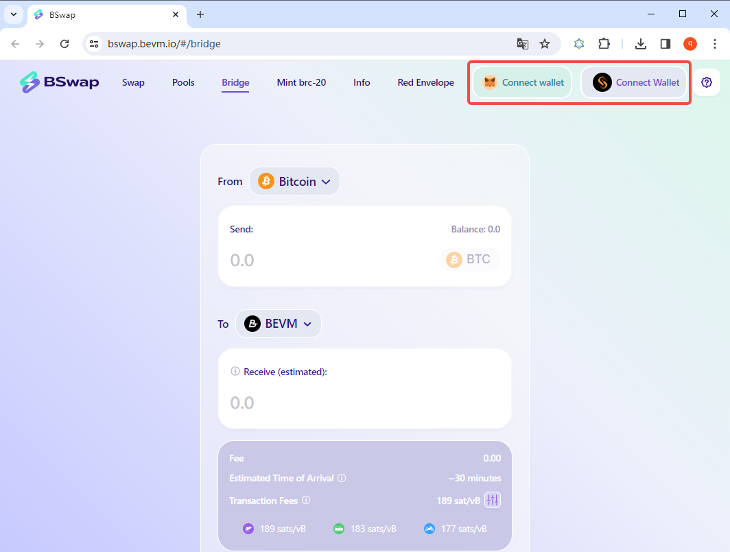 5、点击 https://bswap.bevm.io/#/bridge ,连接EVM钱包(小狐狸钱包)和BTC钱包(OKX钱包),注意:您的 EVM 钱包将用于接收从比特币桥接到第 2 层的 BTC。如图4