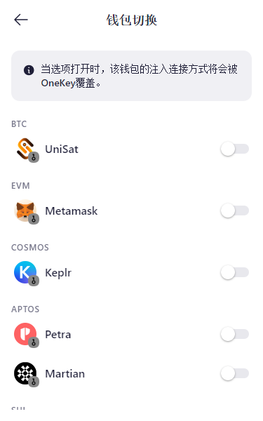 6、连接钱包中总会自动弹出 OneKey 的钱包,重新设置 OneKey ,钱包切换 – 当选项打开时,该钱包的注入连接方式将会被