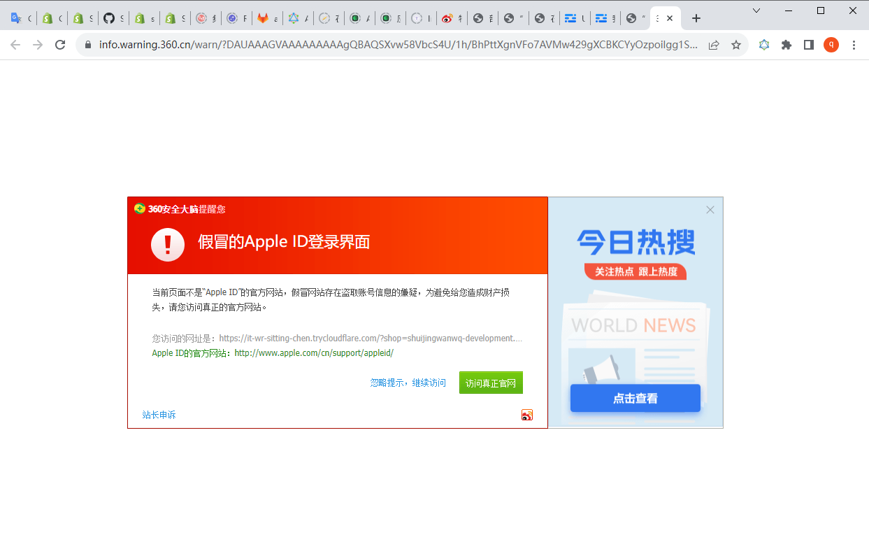 当打开:.trycloudflare.com 的网址时,被360安全大脑提示:假冒的Apple ID登录界面 的解决