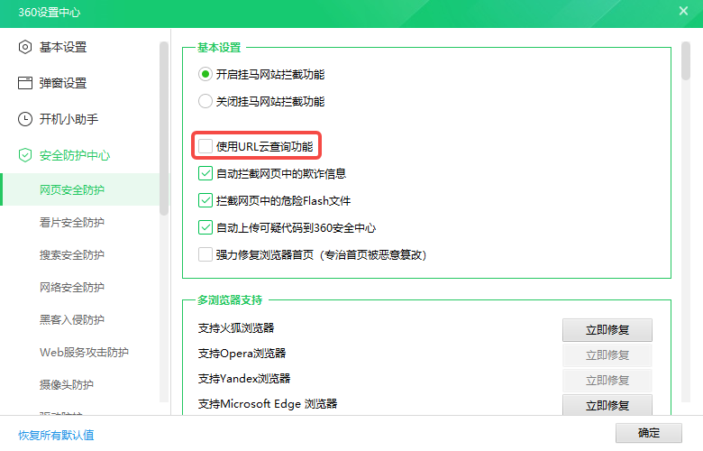 2、点击 忽略提示,继续访问 后,仍然无效。在 360 安全卫士 的设置中心 – 安全防护中心 – 网页安全防护 中,取消勾选 使用URL云查询功能。 如图2