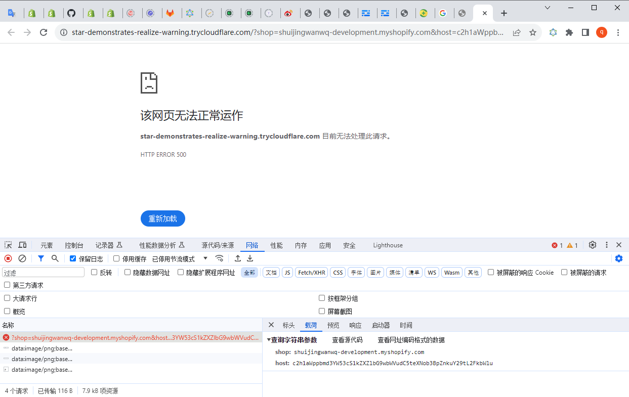 1、在预览 Shopify 的主题应用扩展时,当打开: https://it-wr-sitting-chen.trycloudflare.com?shop=shuijingwanwq-development.myshopify.com&host=c2h1aWppbmd3YW53cS1kZXZlbG9wbWVudC5teXNob3BpZnkuY29tL2FkbWlu