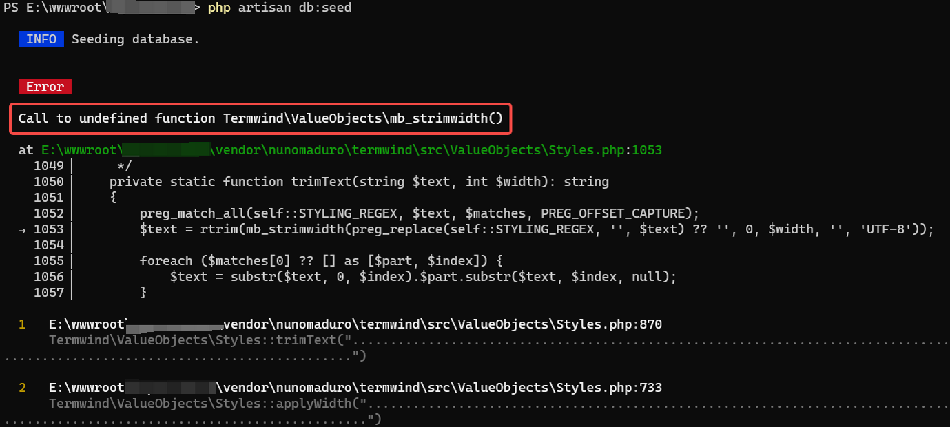 1、报错:Call to undefined function Termwind\ValueObjects\mb_strimwidth()。如图1
