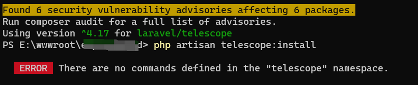 PS E:\wwwroot\erp-backend> php artisan telescope:install ERROR There are no commands defined in the "telescope" namespace.