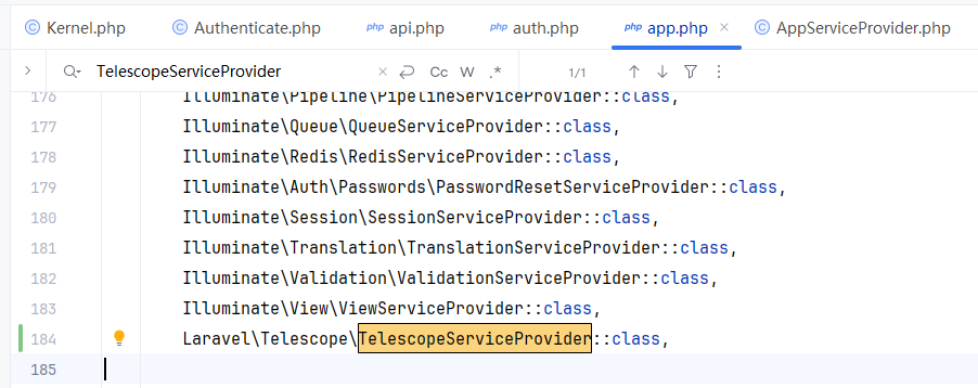 2、发现应用程序的 config/app.php 配置文件中 TelescopeServiceProvider 服务提供者注册 已经删除。先再次添加回去。如图2