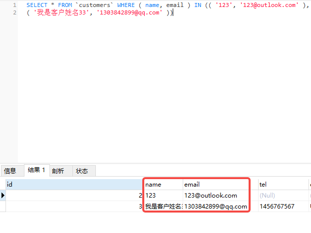SELECT * FROM `customers` WHERE ( name, email ) IN (( '123', '123@outlook.com' ), ( '我是客户姓名33', '1303842899@qq.com' ))