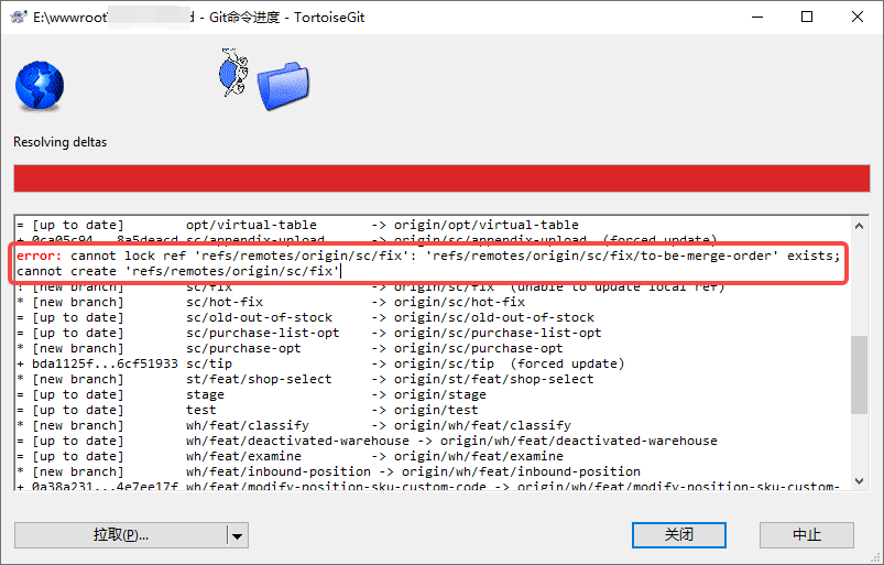 在 TortoiseGit 中拉取时,报错:error: cannot lock ref ‘refs/remotes/origin/sc/fix’: ‘refs/remotes/origin/sc/fix/to-be-merge-order’ exists; cannot create ‘refs/remotes/origin/sc/fix’