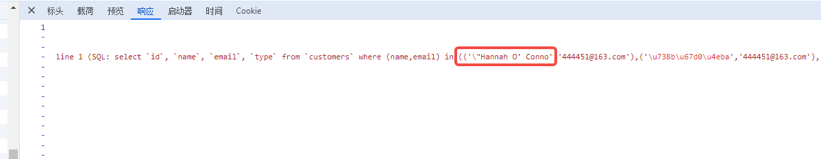 "message": "SQLSTATE[42000]: Syntax error or access violation: 1064 You have an error in your SQL syntax; check the manual that corresponds to your MySQL server version for the right syntax to use near 'Conno','444451@163.com'),('\u738b\u67d0\u4eba','444451@163.com'),('\u738b\u67d0\u67d0','44445@163.' at line 1 (SQL: select `id`, `name`, `email`, `type` from `customers` where (name,email) in (('\"Hannah O' Conno','444451@163.com'),('\u738b\u67d0\u4eba','444451@163.com'),('\u738b\u67d0\u67d0','44445@163.com'),('\u738b\u67d0\u4eba1','444451@163.com'),('\u5ba2\u6237\u59d3\u540d','44445@163.com'),('\u738b\u67d0\u67d0','4444@163.com'),('\u5ba2\u6237\u59d3\u540d100','2222200@qq.com'),('\u5ba2\u6237\u59d3\u540d200','3333300@qq.com'),('\u738b\u67d0\u4eba','44445@163.com'),('\u674e\u67d0\u67d0','4444@163.com'),('\u5ba2\u6237\u59d3\u540d','4444@163.com'),('\u738b\u67d0\u4eba','4444@163.com'),('\u5ba2\u6237\u59d3\u540d2','444444442@163.com'),('\u5ba2\u6237\u59d3\u540d1','44444@163.com'),('\u738b\u67d0\u4eba2','4444@163.com'),('Person-nl Person-nl','customer+denied@email.nl'),('zhuo lynn','zhuolynn881219@gmail.com'),('Harry Potter','fanyan154@gmail.com'),('Test Person-us','customer@email.us'),('1','18345038699@163.com'),('HF','123456@qa.com'),('Daly Siennaa','heodloklrs@iubridge.com'),('ying guo','18345038699@163.com'),('\u90ed\u5f71','425233655@qq.com')) order by `id` desc)",