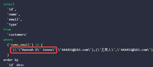 4、不再报错,生成的 SQL 如下。符合预期。Hannah O\’ Conno 已经自动转义。如图2