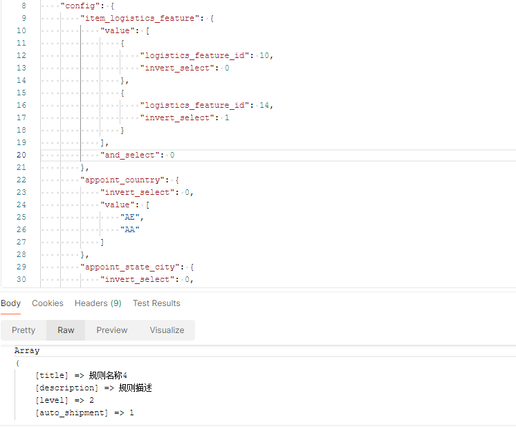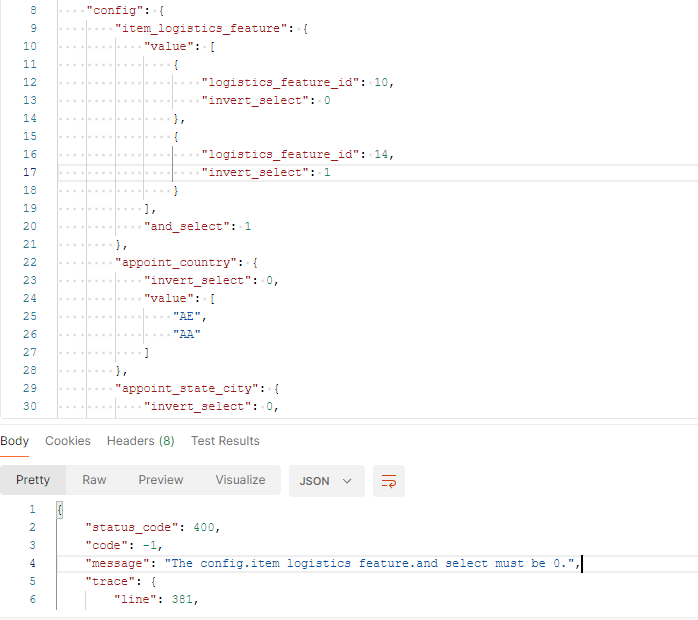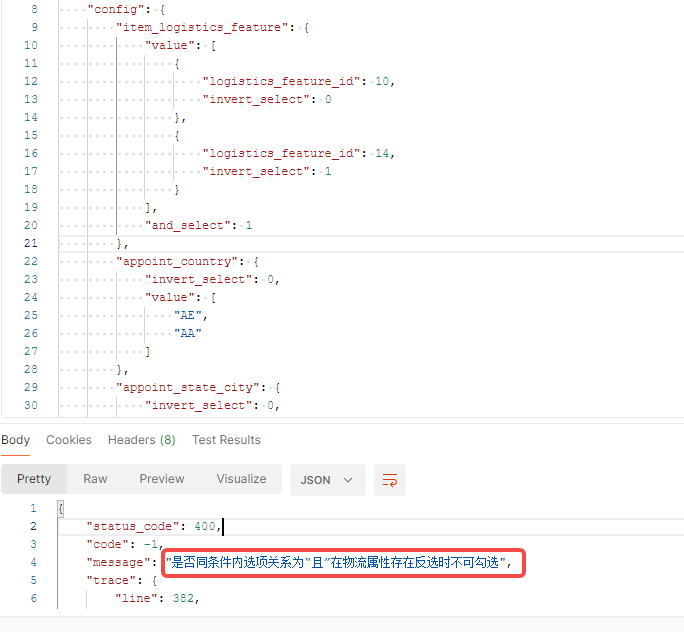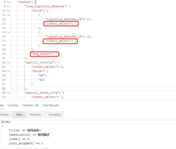 1、现在请求参数如下,只有当 config.item_logistics_feature.value.*.invert_select 全部等于 0 时,才允许 config.item_logistics_feature.and_select 等于 1 ,否则,只能够等于 0。如图1