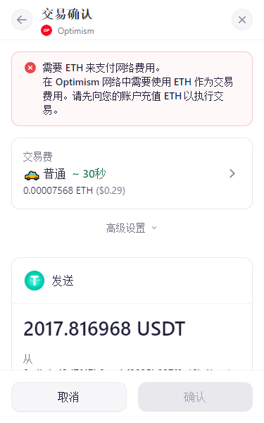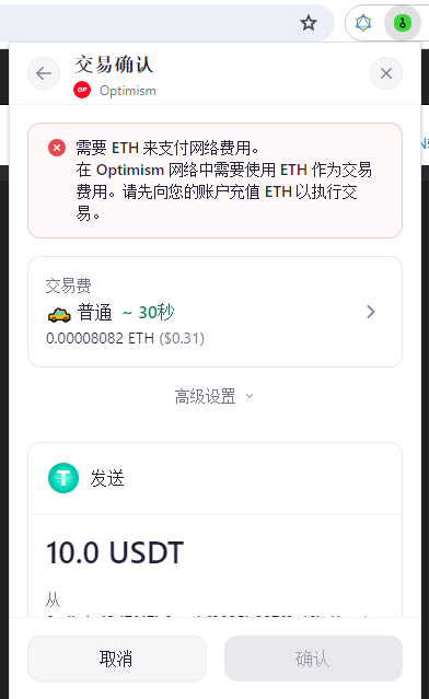 7、重新发送,仍然提示:在 Optimism 网络中需要使用 ETH 作为交易费用。请先向您的账户充值 ETH 以执行交易。如图7
