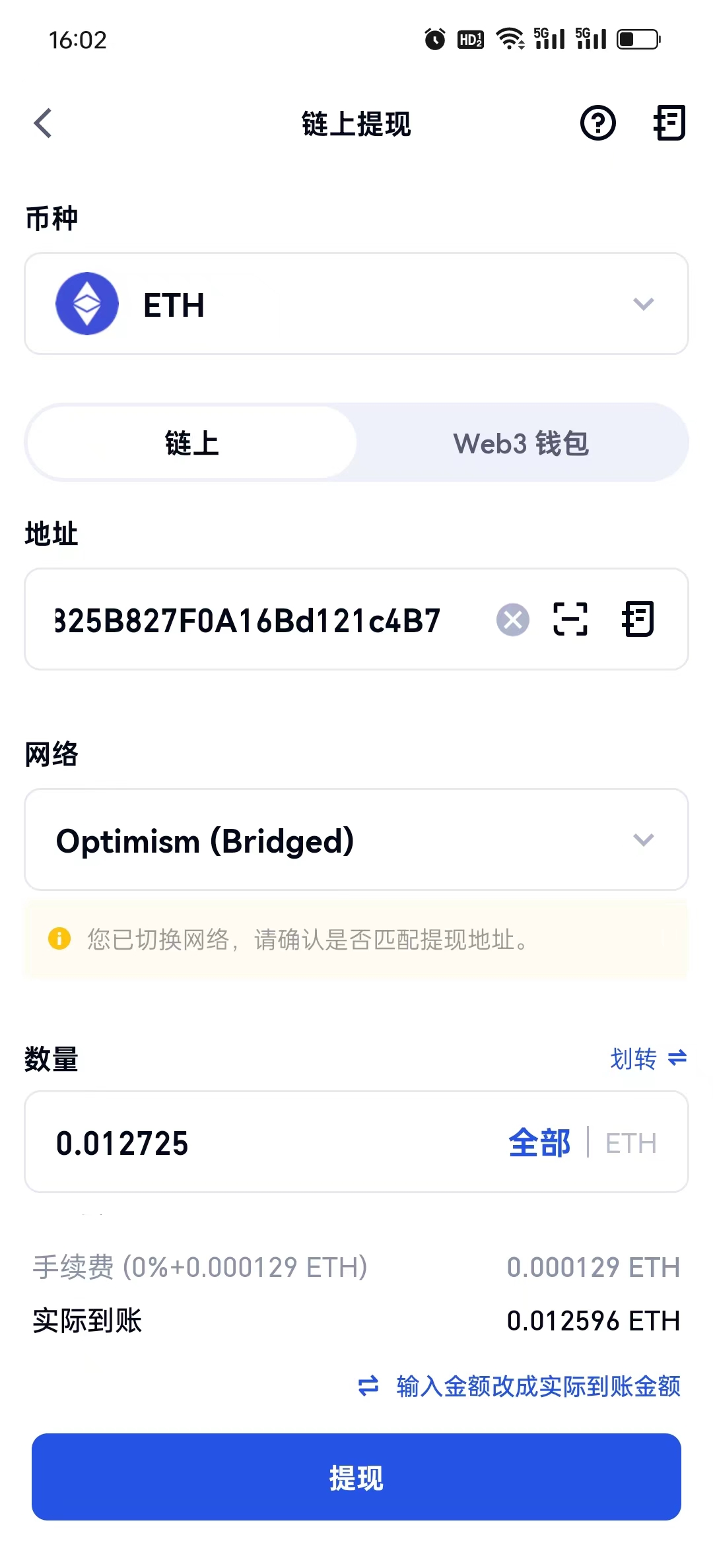 10、不得不向 Optimism 网络中再多充值一些 ETH 了。决定直接链上通过 Optimism 网络发送 ETH 至 OneKey 钱包中的地址。希望 ETH 能够直接到达 OneKey 钱包中的 Optimism 网络。如图10