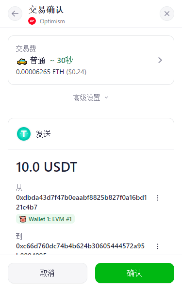 在 OneKey 钱包中,发送 Optimism 网络中的 USDT 的流程
