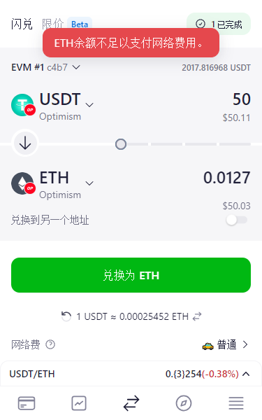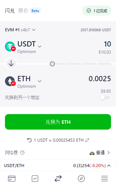 2、计划使用钱包的闪兑功能,在 Optimism 网络中将一些 USDT 兑换为 ETH。如图2