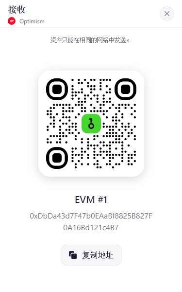 4、看来只有向 Optimism 网络中充值一些 ETH 了。点击接收,复制地址。如图4