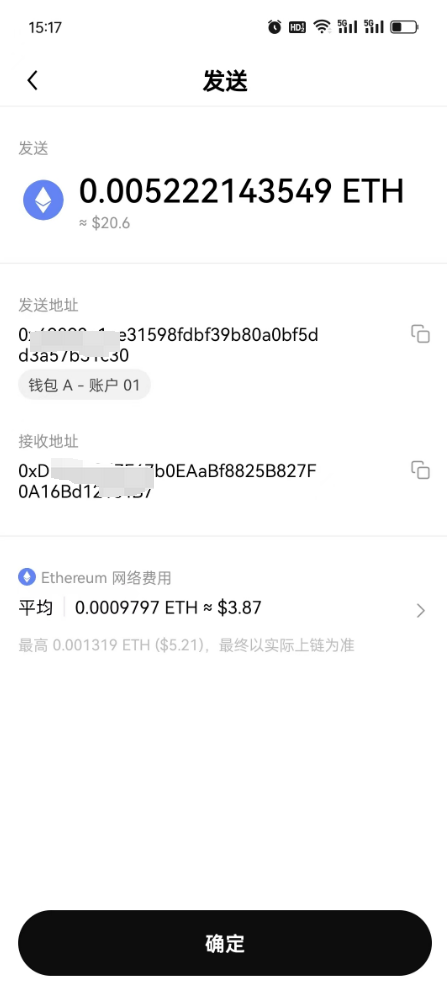 5、决定将 OKX 钱包中的 ETH 发送至地址。如图5
