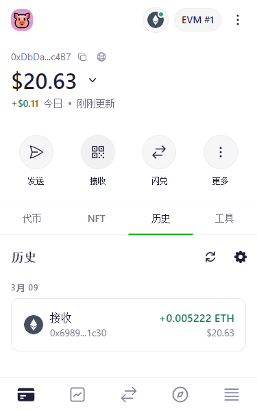 6、然后在 OneKey 钱包的 ETH 网络中可以看见接收到 ETH。如图6
