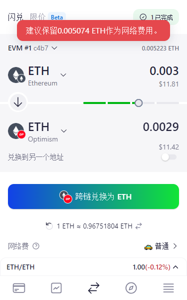 8、决定将 OneKey 钱包中,ETH 网络中的 ETH 闪兑至 Optimism 网络中的 ETH。提示:建议保留0.005074 ETH作为网络费用。如图8