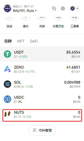 1、在 https://tinys.pl/cn/swap 上用 SOL 购买得到 NUTS,在 欧易 Web3 钱包 中显示数量为 0。如图1